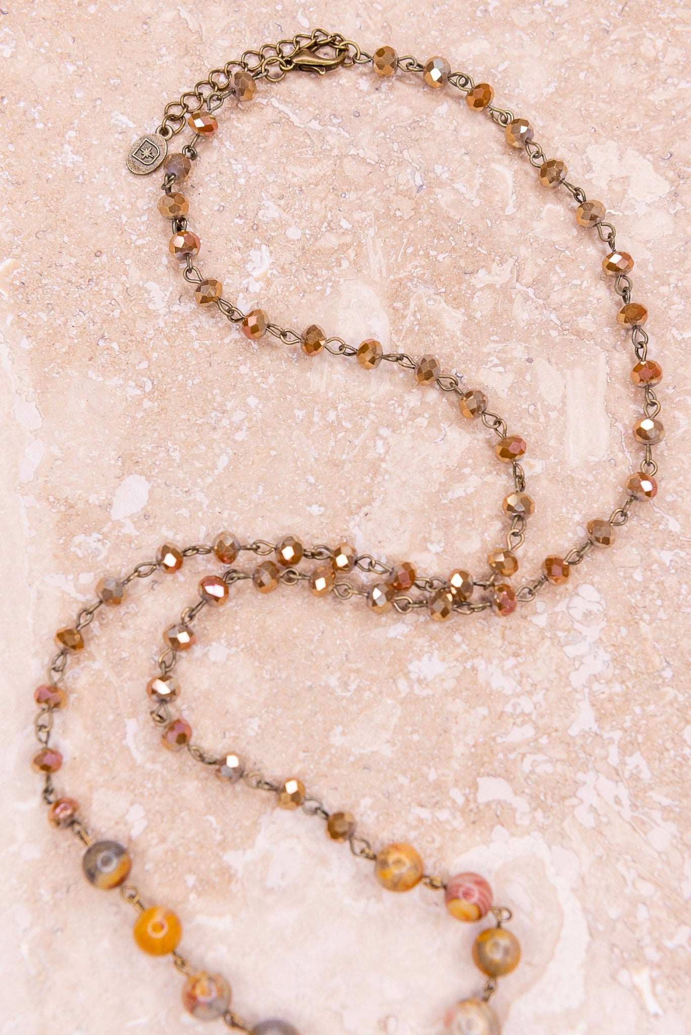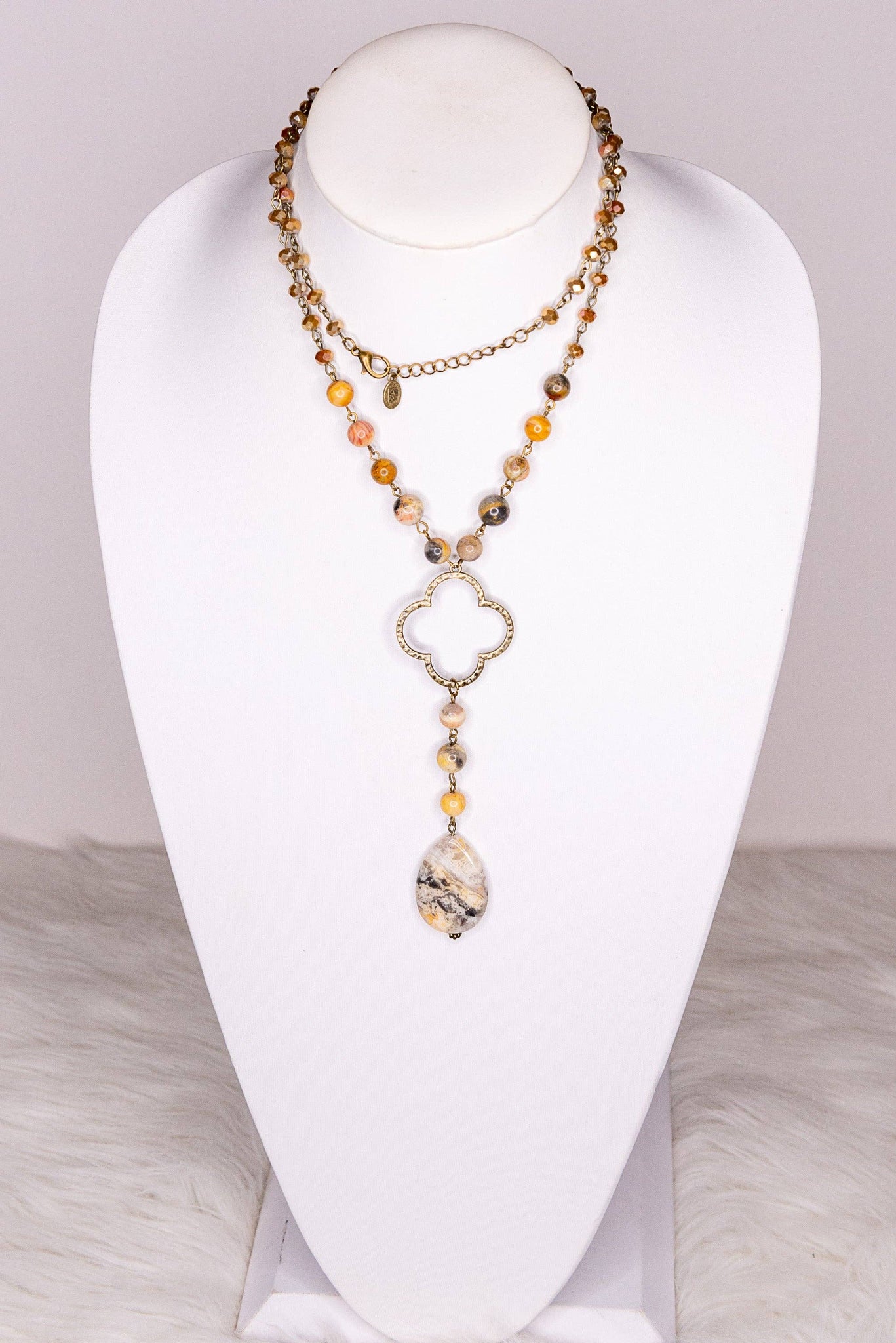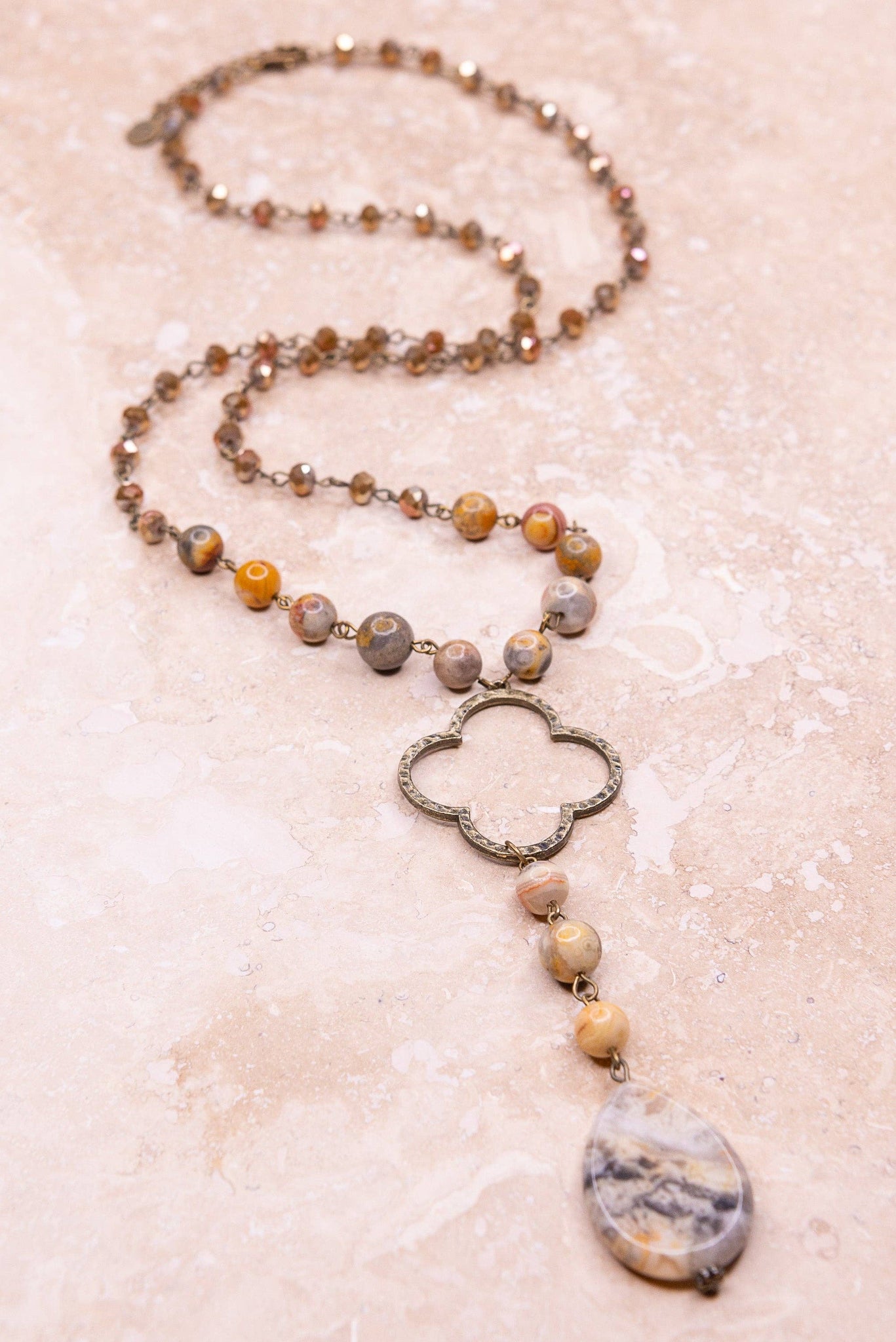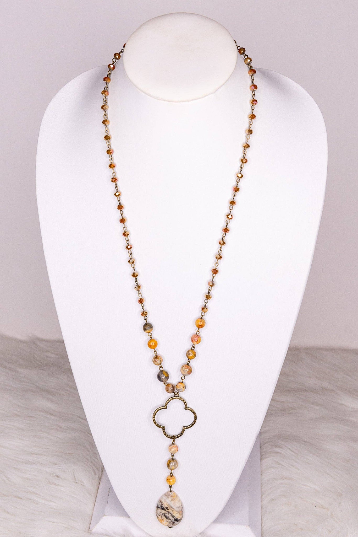 Long, adjustable chain link necklace with crystal and stone beads. Includes a 2" extender. The lariat style hanging pendant features a bronze clover and a polished stone. Total length (when closed on shortest link): 19"