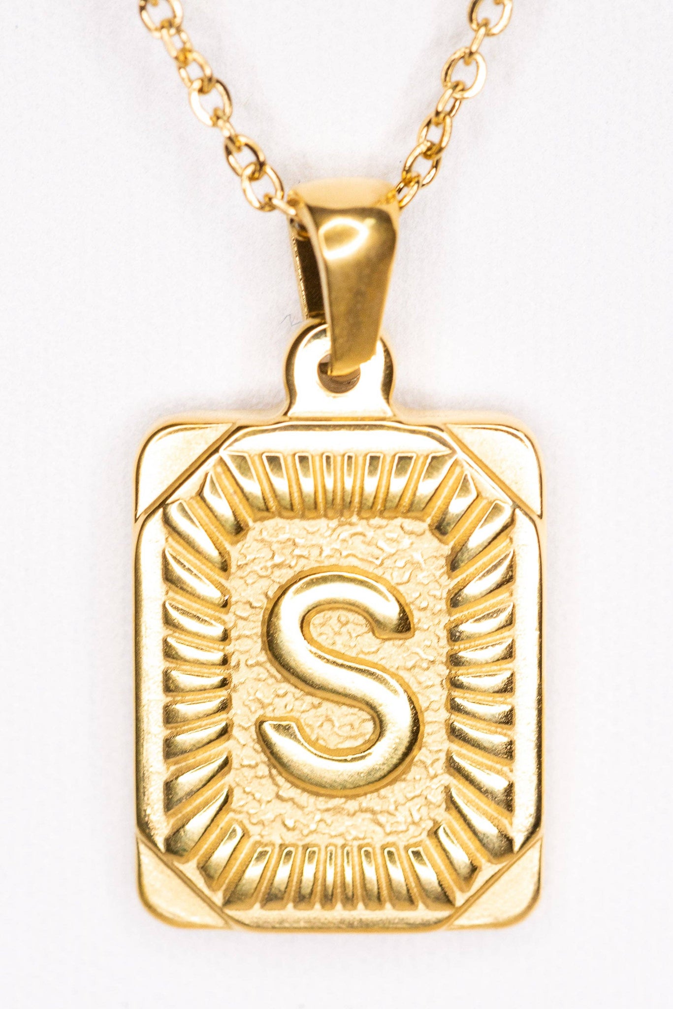 Initial Necklace - Rectangle pendant measures 5/8" wide x 3/4" tall (or 1.125" tall including bale). Features solid textured back of initial rectangle. Chain is 18" long Stainless Steel, Gold plated