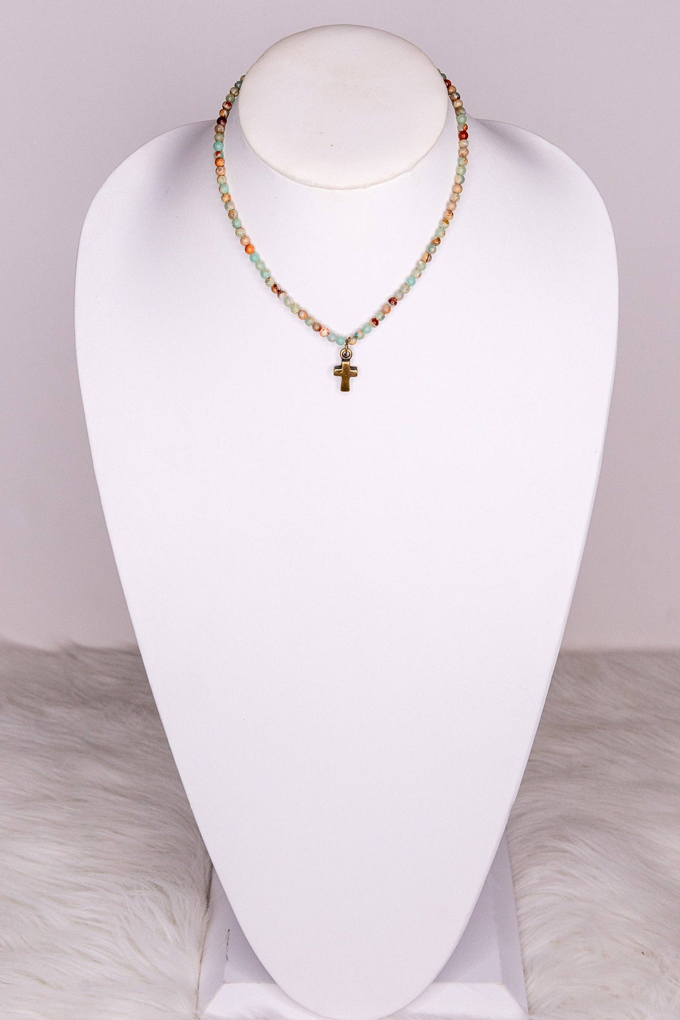 This short, adjustable necklace has small imperial jasper stone beads strung together. There is a small bronze cross charm and lobster claw closure.