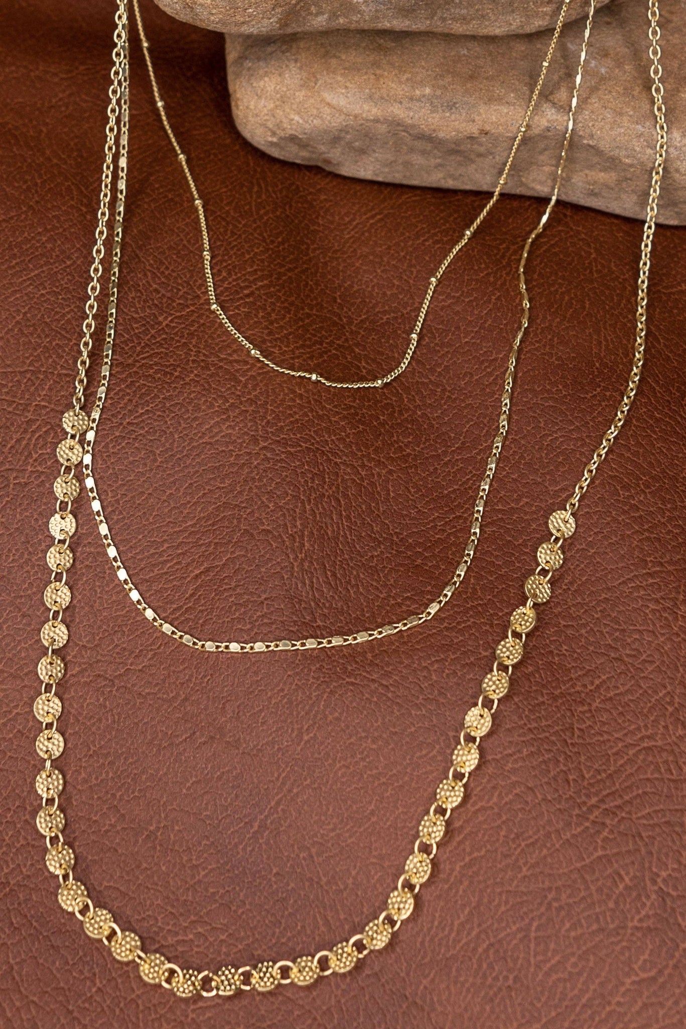 Simple triple layer gold necklace. Lobster claw closure. Measurements (when closed): Longest Chain: 12" Middle Chain: 10" Shortest Chain: 8"