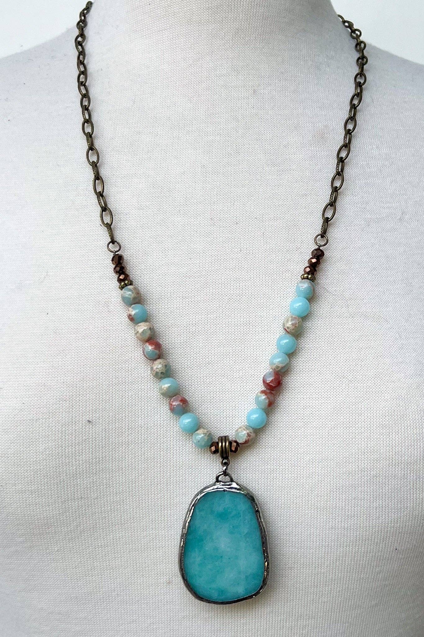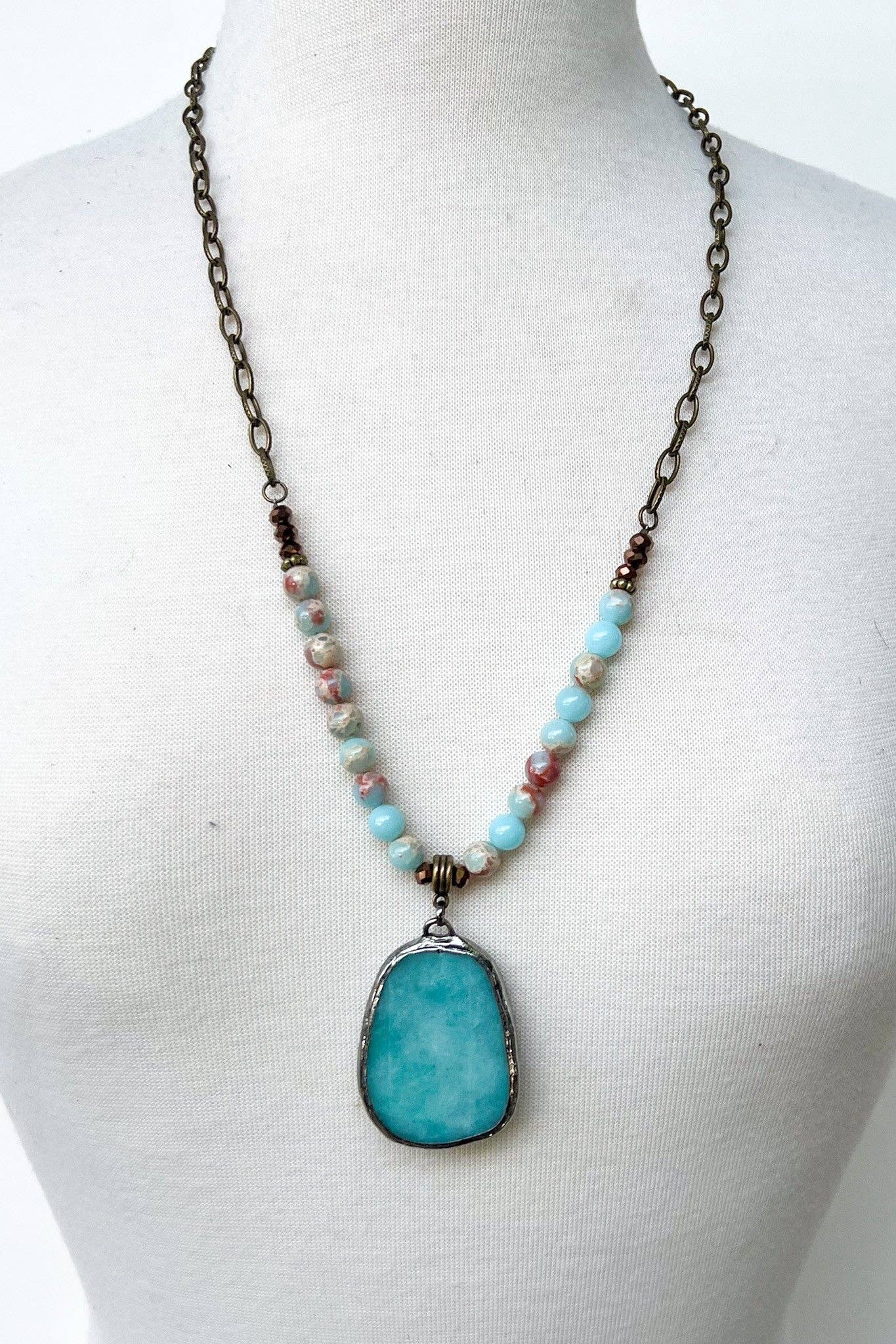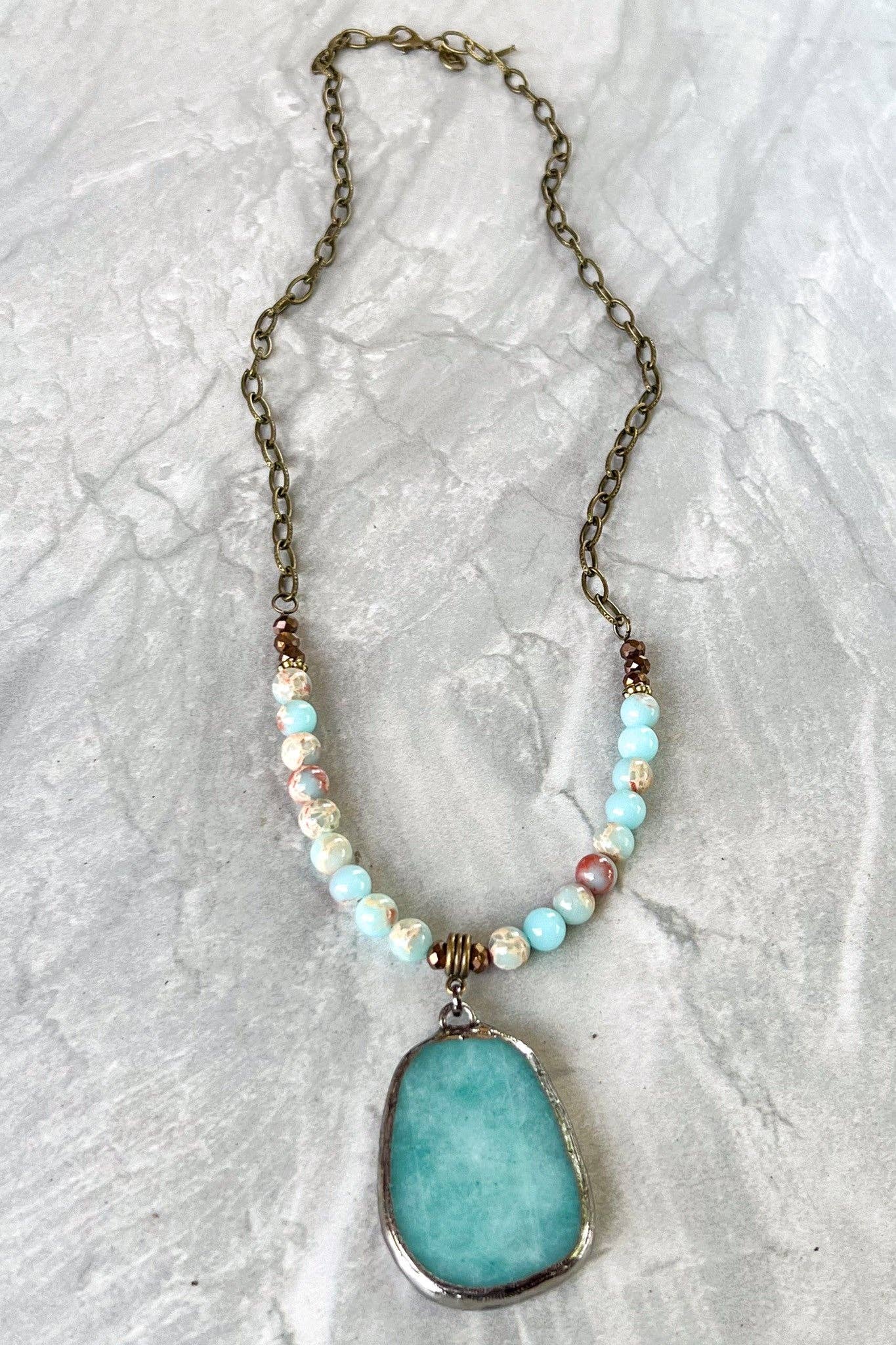 Long chain link necklace with natural amazonite stone beading and a natural stone pendant. Length: