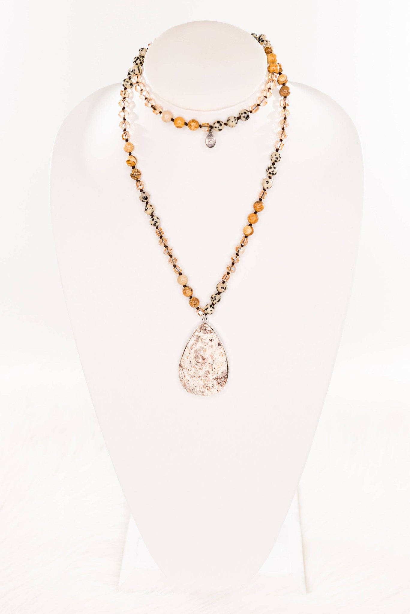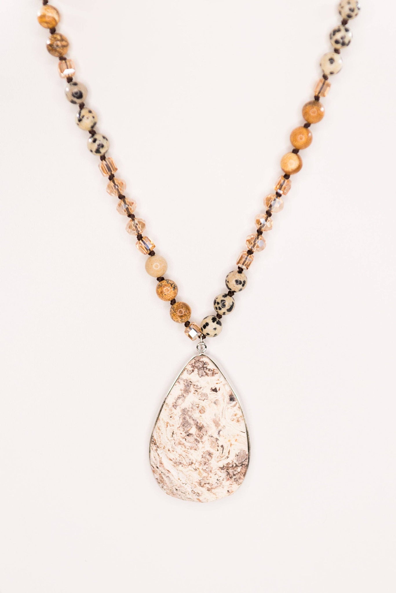 Long, multi beaded strand holding a natural stone teardrop pendant. 19.5" length Due to the natural materials used in Dylan Thomason jewelry, please expect some variation in color and/or texture.