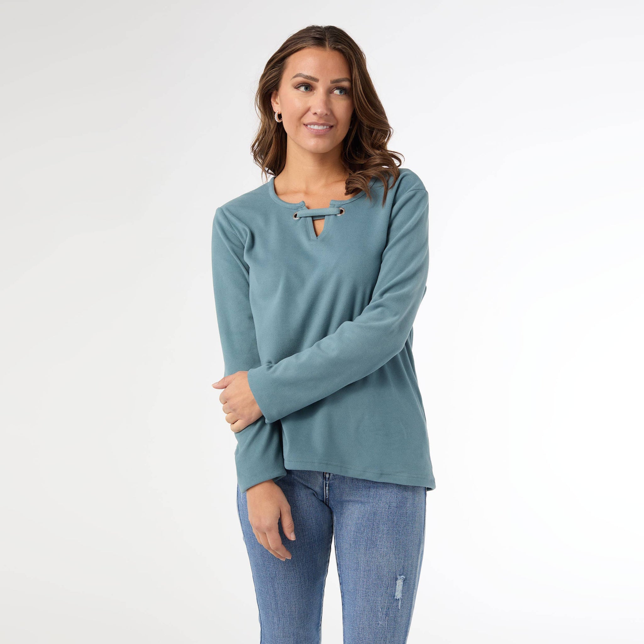 Warm up with the Maylee Soft Brushed V-Neck Top. This must-have essential features soft brushed fabric, grommet accents, unique necklace, relaxed fit, and makes a perfect soft layering piece.