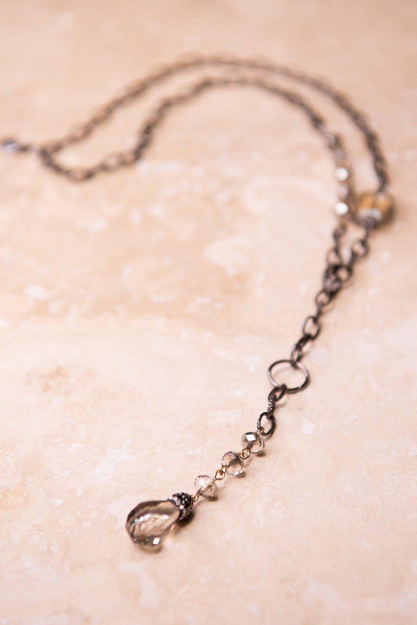 Long lariat necklace with chain links and crystal beading throughout. Features a small crystal pendant at end. This simple chain link necklace is perfect to layer with other styles!