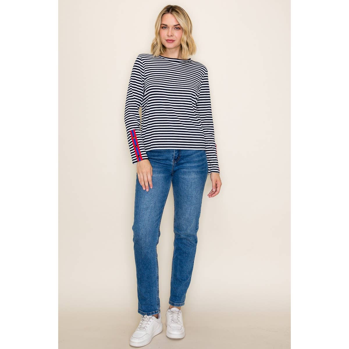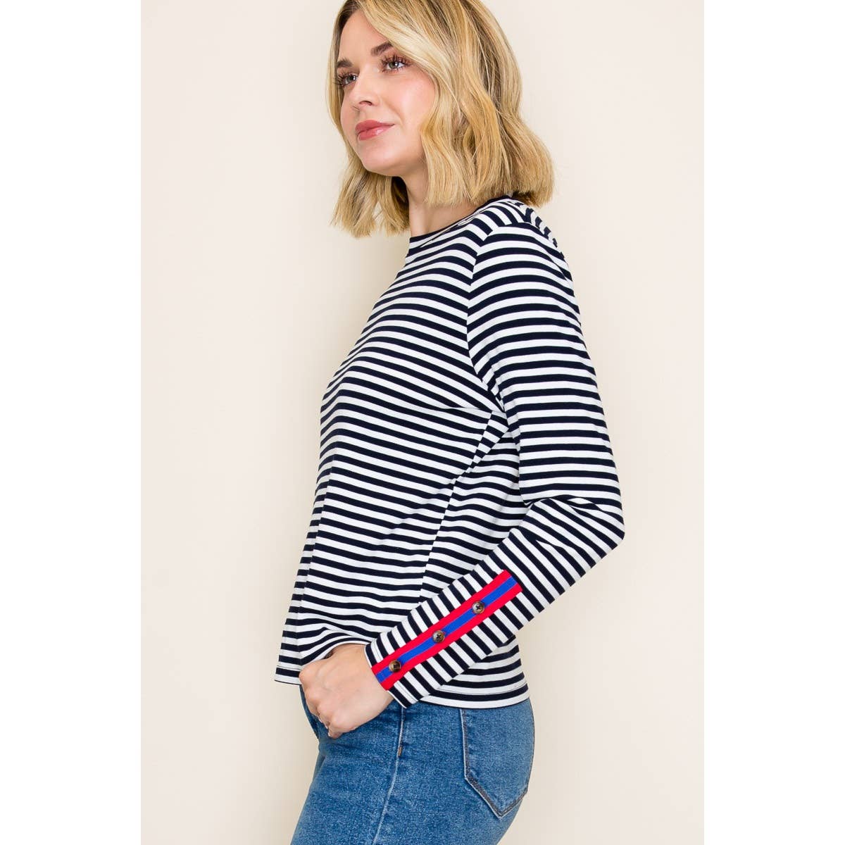 COLOR TAPED BUTTON CUFF STRIPED TOP